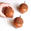 A handmade chocolate acorn shell made with 70% dark chocolate that reveals layers of dark chocolate ganache, Guanaja cremeux, cacao dacquoise, banana caramel, and exotic mousse