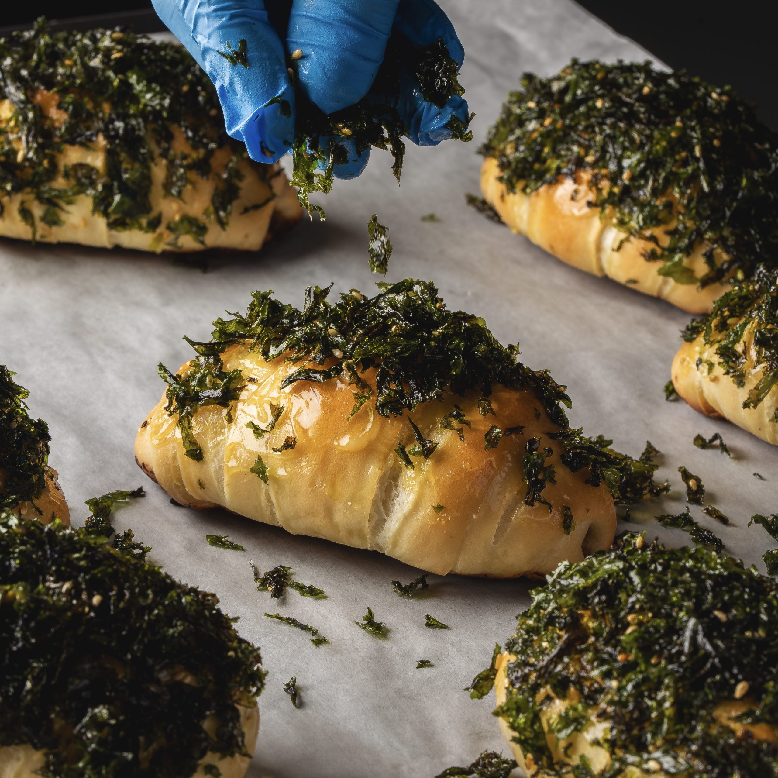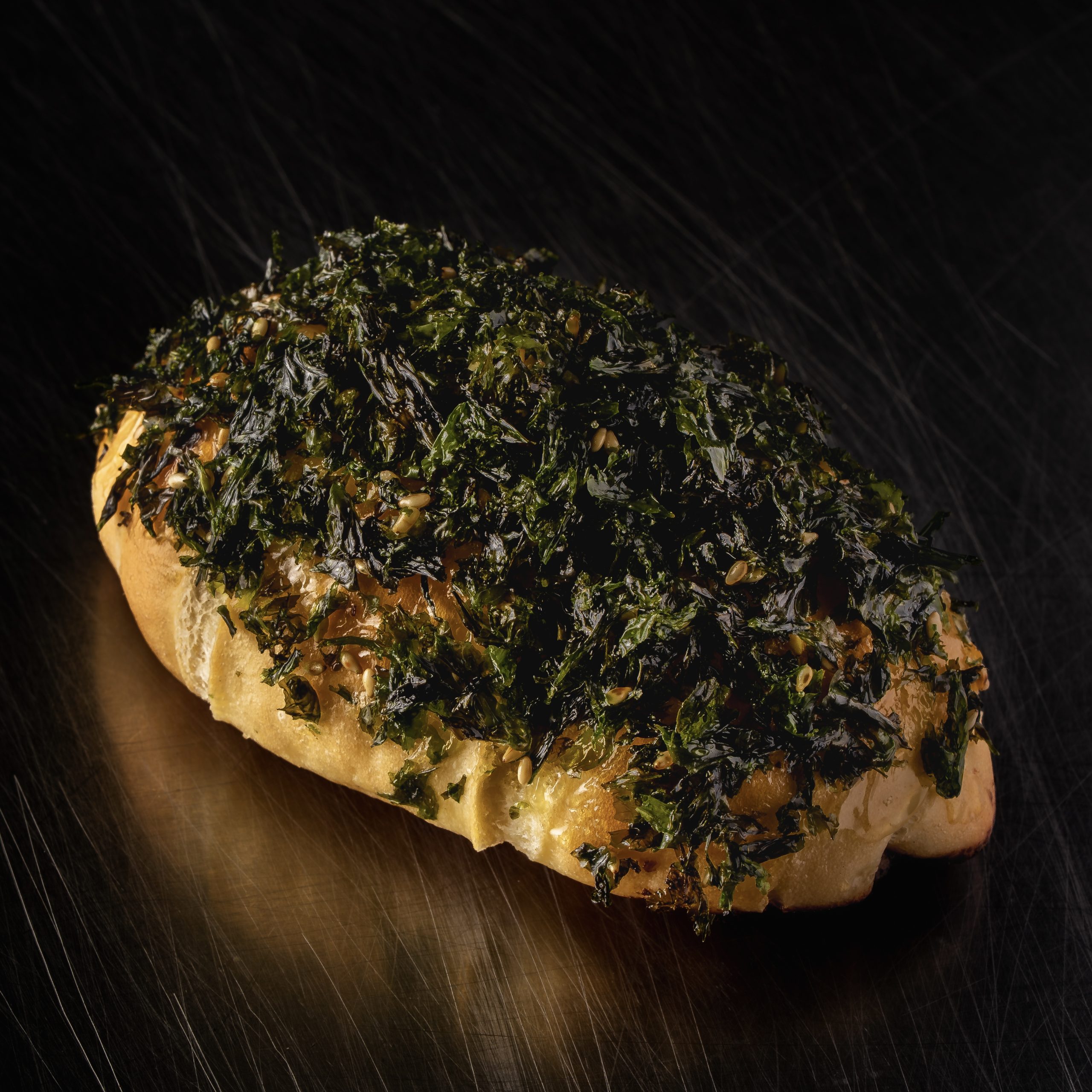 A crisp, golden roll layered with rich kombu butter and finished with roasted seaweed flakes for an irresistible umami kick.