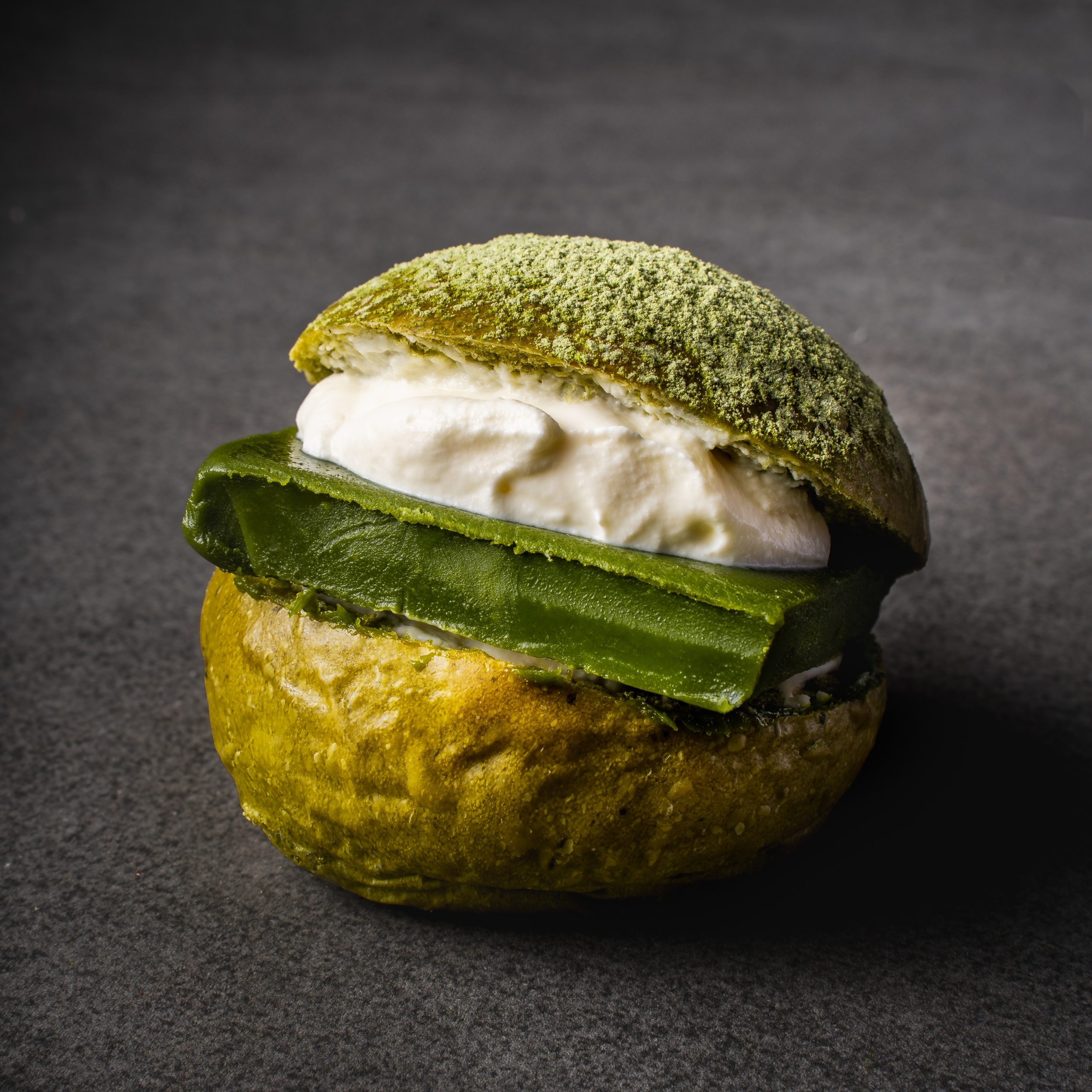 Matcha bun filled with rich matcha nama chocolate and smooth mascarpone, finished with a light dusting of matcha powder