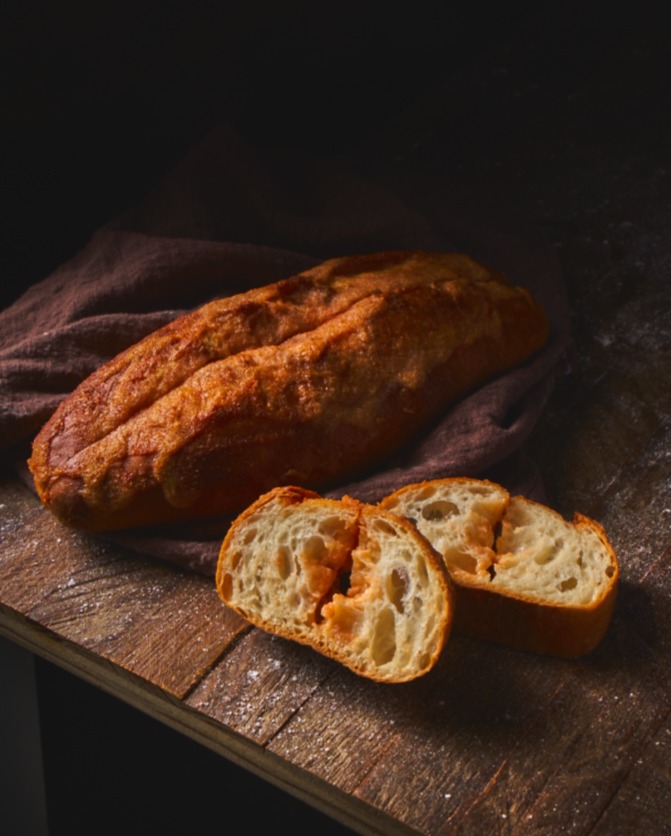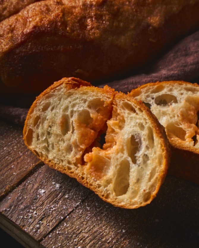 A crisp, golden baguette baked with savoury mentaiko, then generously finished with a creamy mentaiko spread.