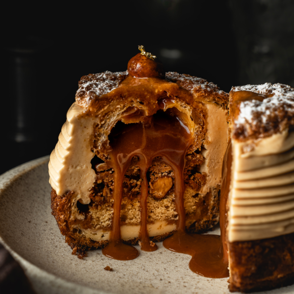 Pâte à choux, generously filled with luxurious whipped hazelnut mousseline, molten hazelnut, and hazelnut biscuit, crowned with a touch of caramelized hazelnut.