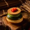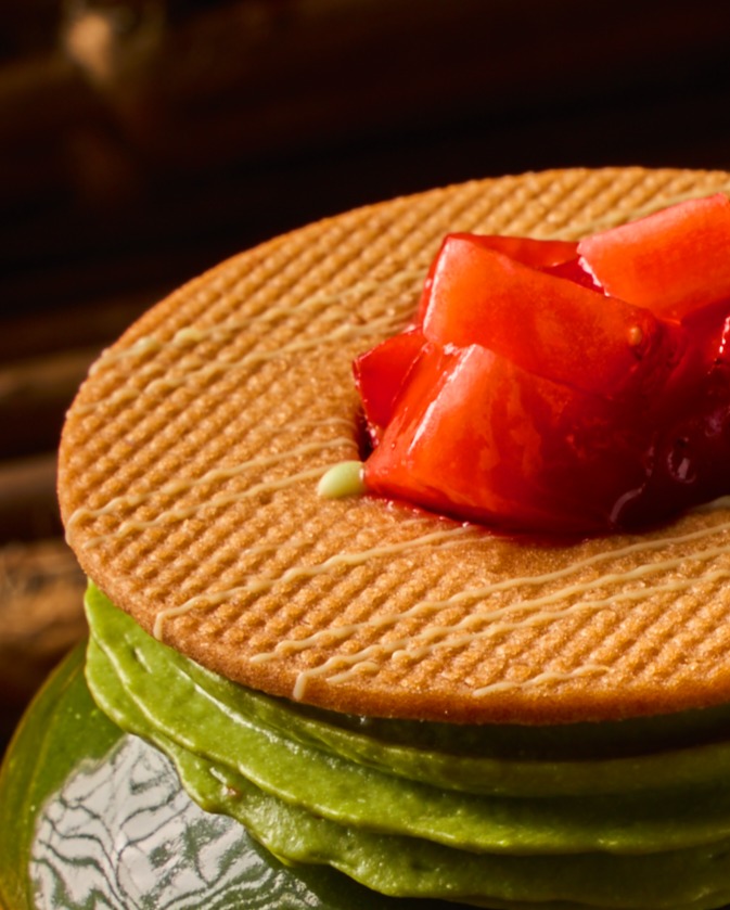 A fluffy donut filled with strawberry jam and matcha cream, glazed with matcha, and finished with a buttery cookie and marinated strawberries on top.