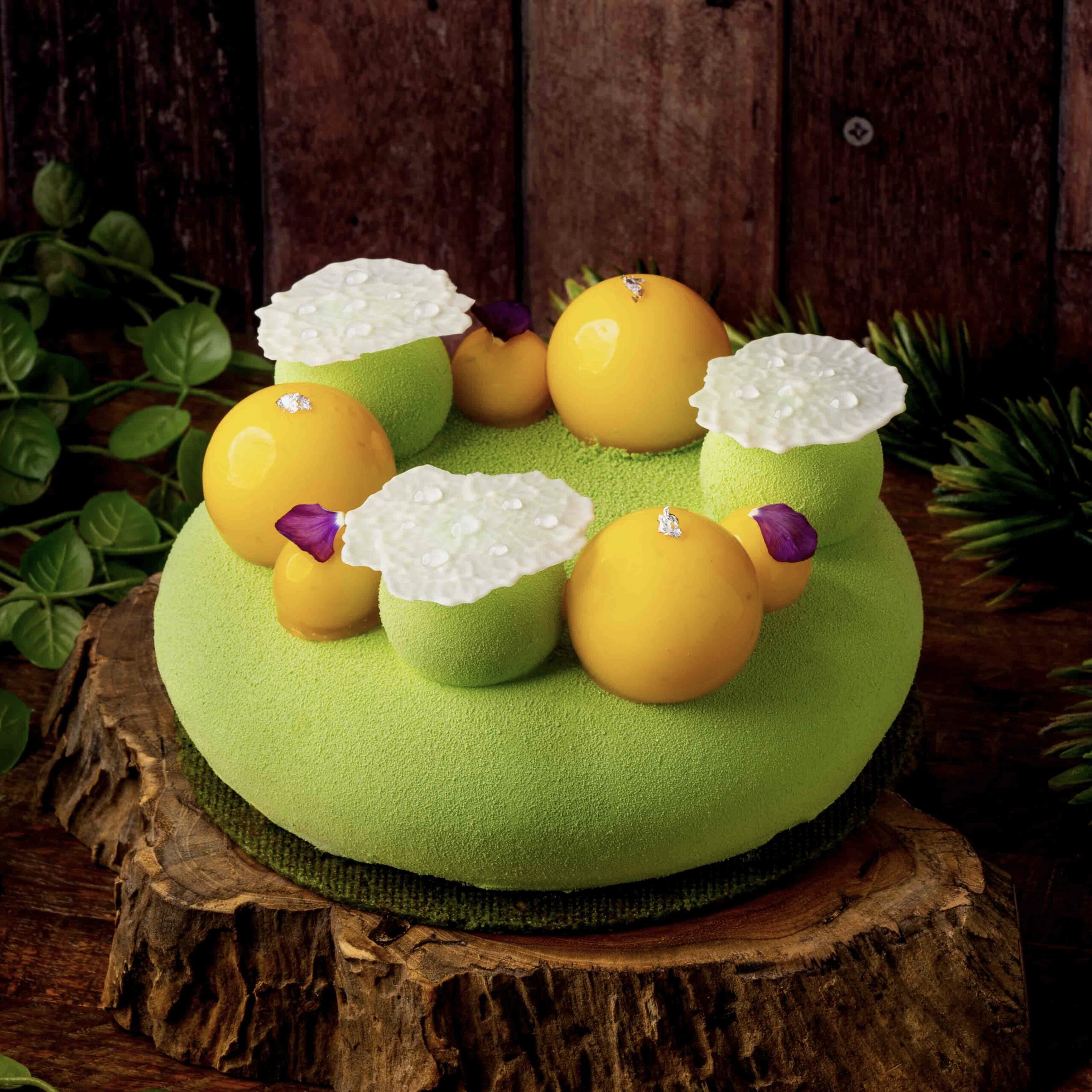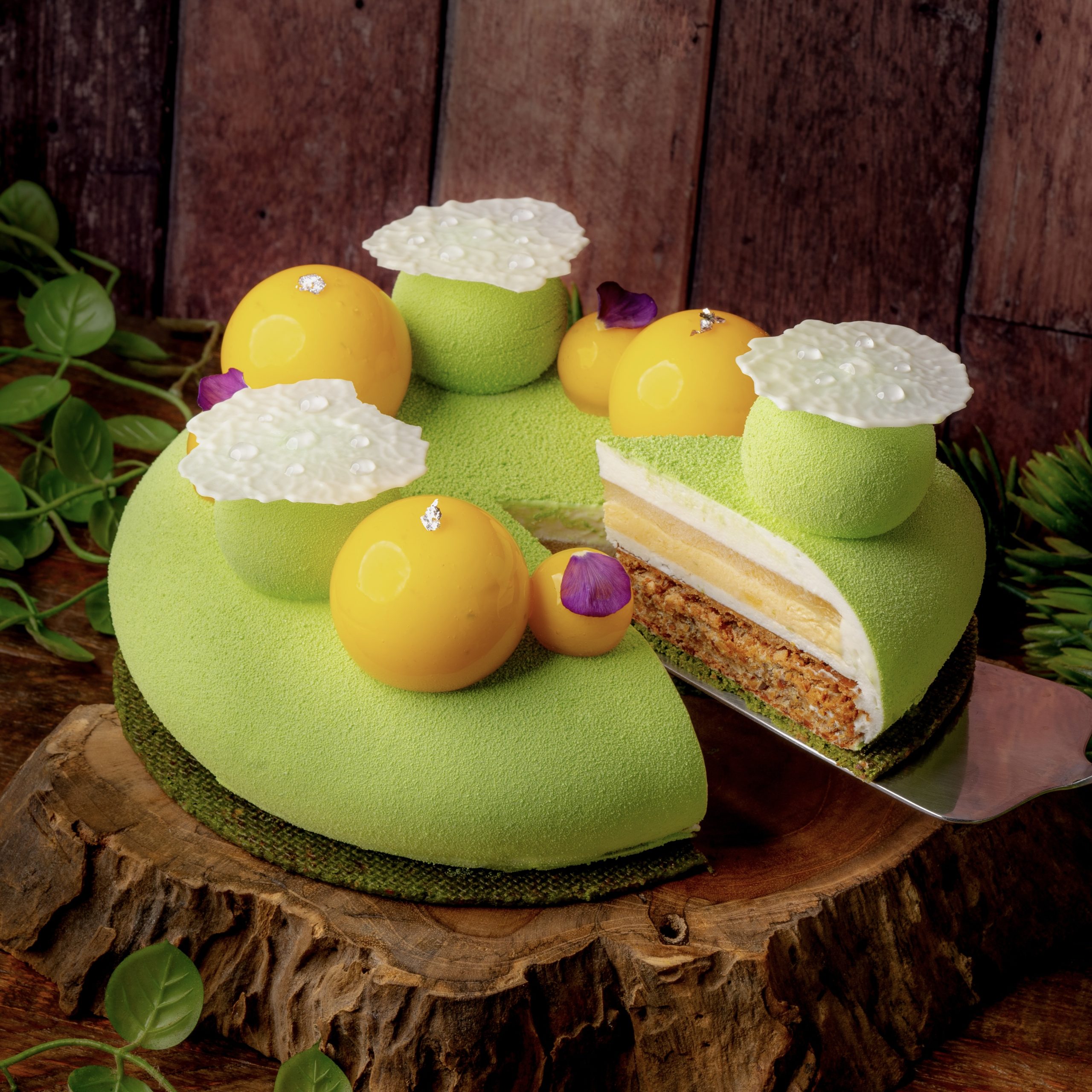 A unique and harmonious blend of calamansi crémeux with lime jelly and pistachio dacquoise, sheathed beneath a beautiful layer of lime cream cheese, and mascarpone mousse.