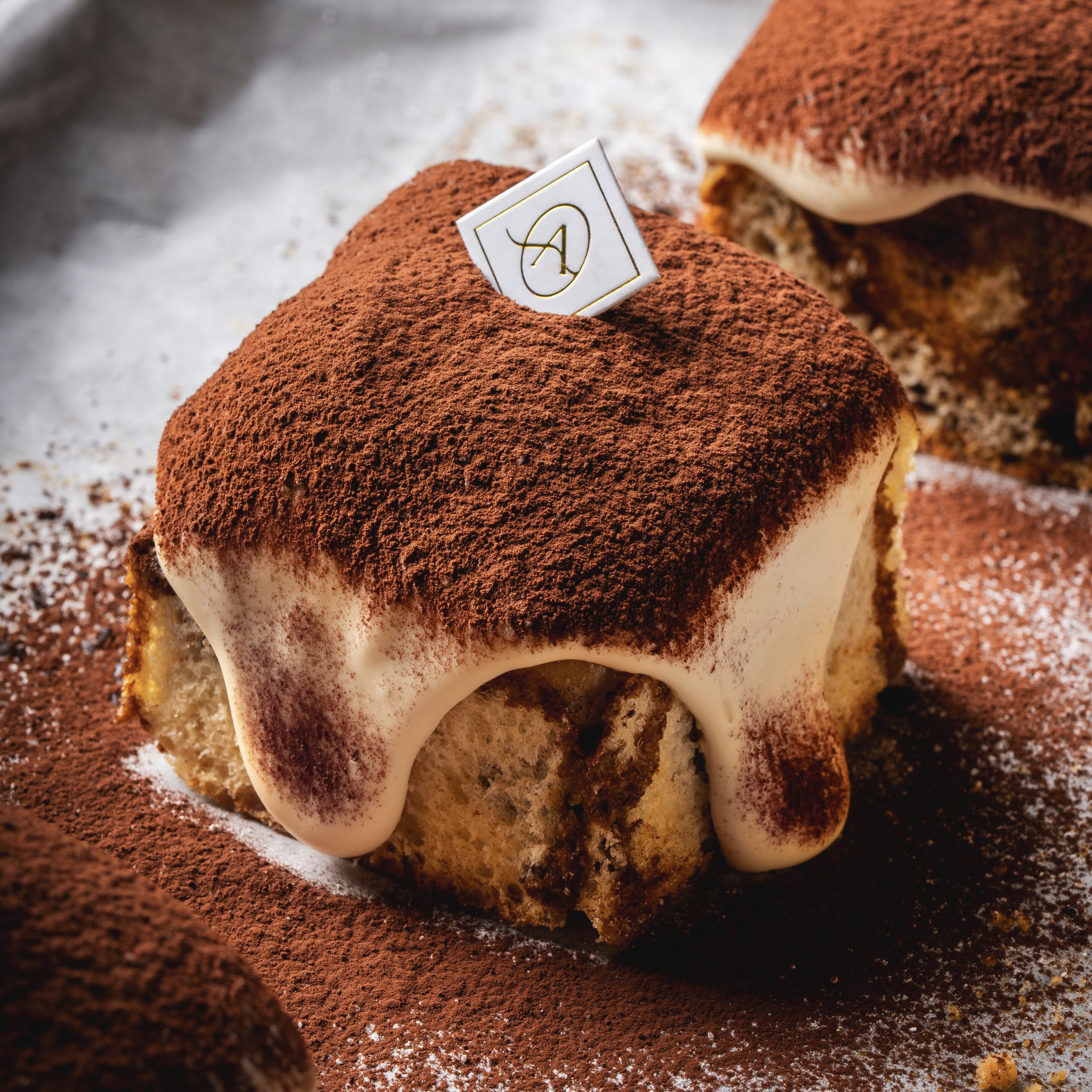 Cinnamon bun topped with mascarpone cream infused with dark rum, finished with a dusting of chocolate for a refined touch.